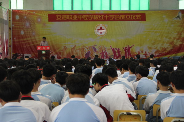 为弘扬“人道、博爱、奉献”的红十字精神,帮助职专生树立正确的世界观、人生观和价值观,促进校园精神文明建设,安海职业中专学校于2015年5月7日上午举行“安海职业中专学校红十字会”成立仪式。晋江红十字会专职副会长陈礼新、晋江红十字会秘书长曹荣山、安海镇派出所所长李章其、安海法庭庭长蔡忠楚、安海交警中队队长许文芳、安海消防中队队长刘永强、安海职业中专学校校长李克勤等领导出席成立仪式。