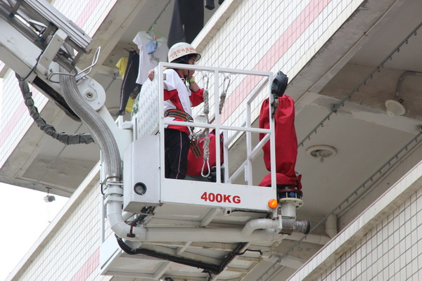 下午4点30分,刺耳的警报声拉响,安全指挥中心下达了“学生宿舍楼发生火灾,请同学们迅速撤离”的命令。楼梯通道口的消防员拉响烟幕弹,瞬间浓烟滚滚,住宿生们按照预案规定的路线,弯着腰、猫着步,用手帕、毛巾等捂住口鼻,沿着学校指定的楼梯口快速前进,有序撤离到学校操场的安全地带。这次疏散活动还特意安排了用消防云梯救护被困人员演练项目。演练共用时2分多钟,整个过程紧张有序、实用性强,收到了预期效果。