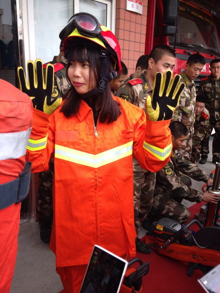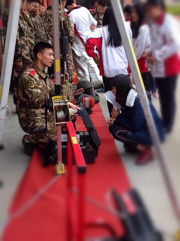在消防官兵的带领下,同学们首先参观了各类消防车辆及一些常用的消防装备,了解空气呼吸器、防毒面具、高压水枪、防火服等消防装备的不同用途,并亲自体验了穿着消防战斗服戴着消防帽登上消防车的真实感觉。随后,同学们还参观了消防武警官兵的内务,宿舍里平整的床铺、"豆腐块”的被子,储物室里整齐排放的各种生活用品,让同学们连连赞叹。