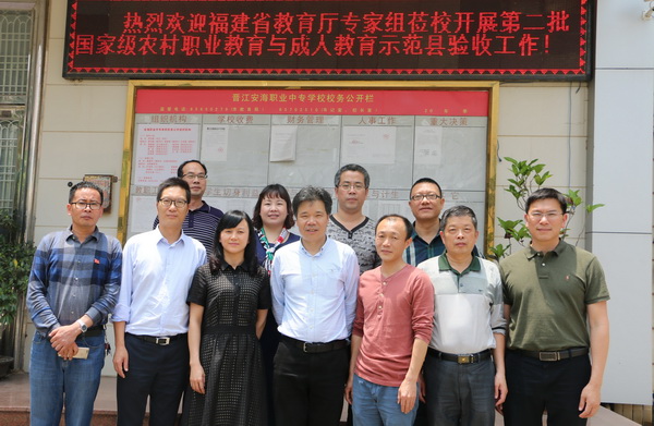 近日,福建省教育厅职教中心教研部主任游金水带领专家组一行3人来到晋江,对我市创建第二批国家级农村职业教育与成人教育示范县开展评估验收工作。晋江安海职业中专学校作为专家组实地察看的三个场地之一,于2017年4月26日迎来了省厅专家、泉州市教育局领导、晋江市领导和晋江市教育局领导等的检查。