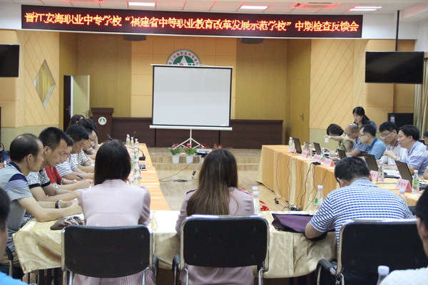 最后专家组主持召开了安海职校省中职改革发展示范校中期检查反馈会。七位专家做了全面、细致、深入的反馈,一方面肯定了学校在省示范校建设中取得的良好成绩,另一方面指出了需要整改、提升的部分,对学校省示范校后期建设也提出了建设性的建议。反馈会上,晋江市教育局副局长蔡惠琼表达了对专家组感谢,并表示晋江市教育局会协助、督促安海职校对专家组所提的意见进行认真的整改。