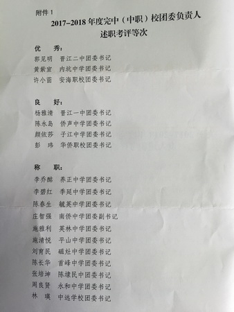 团市委于2018年9月21日组织完中(中职)校团委负责人进行本年度述职考评,此次述职考评的对象为各完中(中职)校团委的负责人共21人。经考评小组审议,共评出优秀等次3人,良好等次4人,称职等次14人。我校许小茴老师在此次考评中获优秀等次。