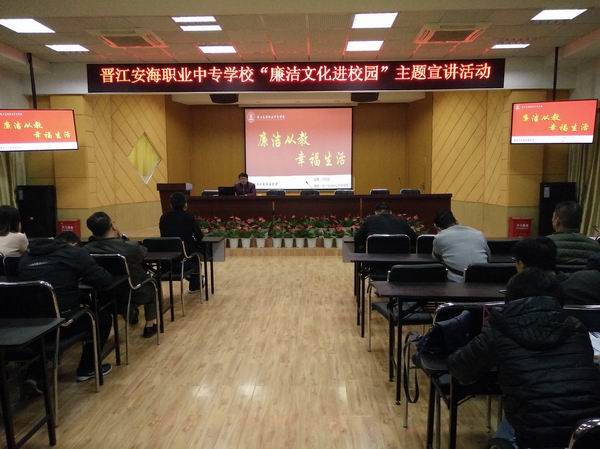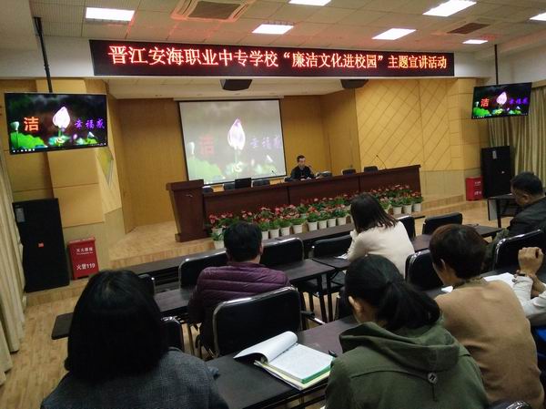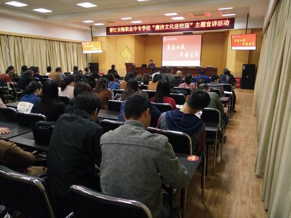 最后,柯明春副书记强调:反腐警钟长鸣,廉洁文化常在。相信安海职校的全体教职员工经过此次廉洁文化进校园的宣讲活动,对廉洁文化有了更为明确的认识,我们要更加珍惜自己的工作,爱岗敬业,清明成长,让廉洁文化在校园里绽放着迷人的清香。