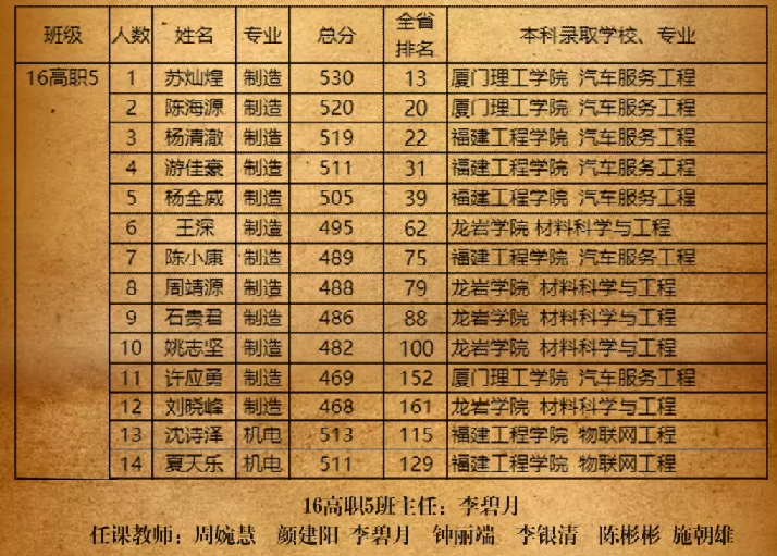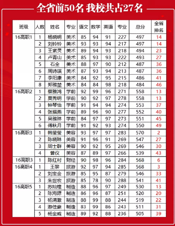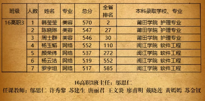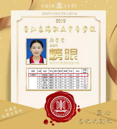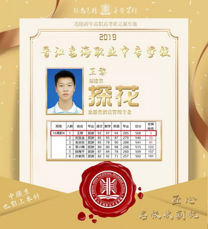 从个人名次来看,今年福建省有七万余考生参加高职高考,我校共计27名同学位居全省前50名中。其中韩莹莹同学在全省医药卫生类8365人的激烈竞争角逐下,在本科录取率不到1%的情况下,摘得榜眼 ,总分高达570,实属不易!王黎同学以总分568分获得福建省旅游类高职考试探花,真是可喜可贺!此外,陈红村列财经类第6名,苏志文居美术类第7名,蔡雅鸿、莫秀明获教育类第13名,苏灿煌为制造类第13名,刘铃铃、杨晓明获美术类第14名,陈海源为制造类第14名。