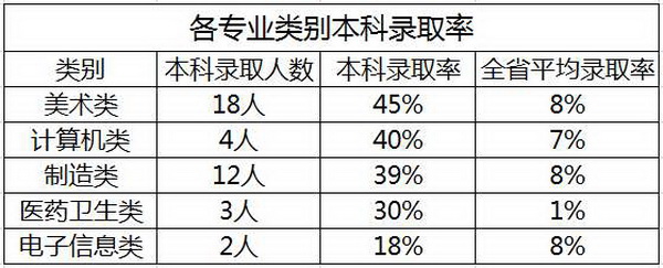 从本科录取结果来看,在全省平均录取本科率只有3%的激烈竞争下,我校共有39名同学录取大学本科,本科录取率高达34%,其中美术类高达45%。