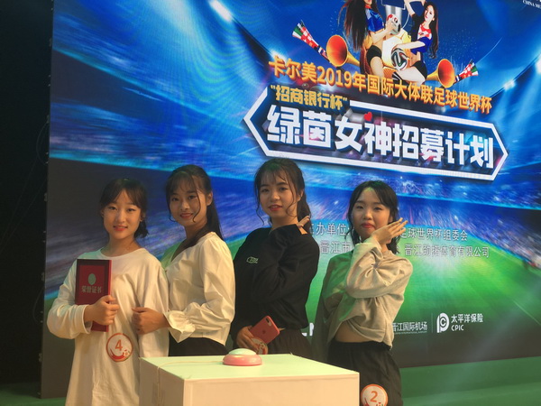 卡尔美2019年国际大体联足球世界杯“招商银行杯”绿茵女神总共分为三个阶段:星启程(线上投票),星挑战(复赛)及星闪耀(决赛),在线上投票环节。通过抖音热门歌曲为背景音乐+自编舞蹈进行投票,我校有七名同学入选到复赛环节。经过一路过关斩将,我校苏安娜、张钰滢、陈静,肖雨霞等四位同学进入到晋江电视台总决赛。面对华侨大学、泉州师院、泉州大学等高校对手,通过一轮轮的比拼,我校张钰滢同学顶住压力,尽显专业优势,经过唱歌、跳舞、走T台、知识问答等环节,从众多选手中脱颖而出,备受评委一致好评,入选卡尔美国际大体联足球世界杯绿茵女神。