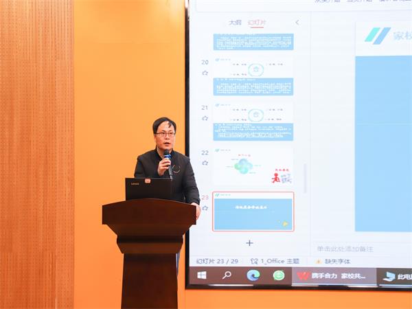 紧接着,黄源华开展了“携手合力,家校共育”的主题讲座。强调了“家校合育”的重要性,指出最完美的教育是家庭教育、学校教育、社会教育的有机结合,提倡“三全育人”模式。指出目前家庭教育的现状存在教育缺位、教育越位、教育固位、教育盲位等问题;针对如何开展家校“合”育,强调家庭教育和学校教育应该各司其职,互为补充,和谐共存,相互交融的重要理念,只有家校齐心合力,才能共同护佑学生健康安全成长。