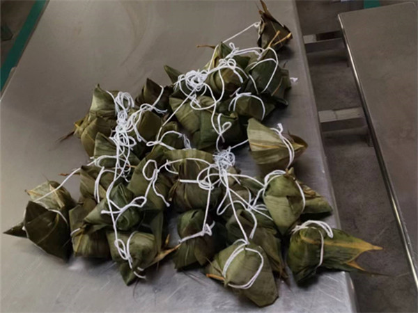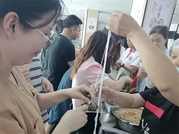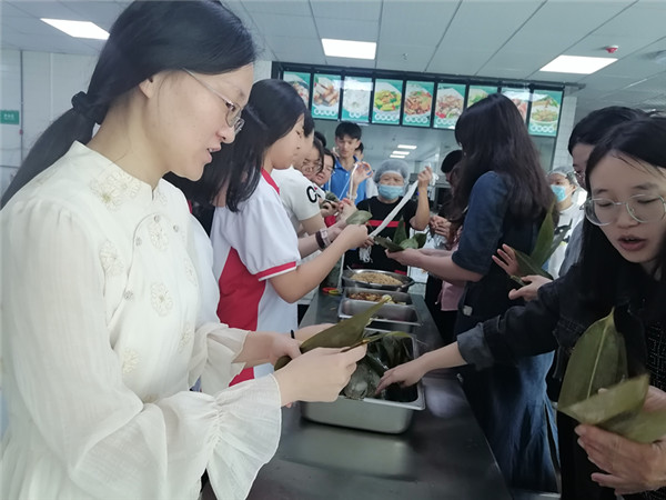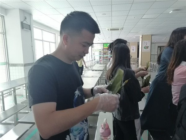 “粽叶卷出一个窝,放上糯米,卷紧了……”食堂阿姨们一步步向老师、同学们示范讲解如何包粽子,折粽叶、捏尖角、压糯米、放馅料,裹叶子、绑绳子……很多老师、同学都是第一次包粽子,“哎呀,糯米漏出来啦”、“哎呀香菇忘记放啦”......大家围绕在桌子旁,温馨的现场“笑话”频发,你一言,我一语的,笑语不断,气氛热烈。但大家都学得非常认真专注,不多久一个个有模有样的粽子迅速成型。饱满厚实、香甜可口的粽子整整齐齐地码在一起,统一“穿着”暗绿色“服装”,细长的“腰带”轻轻系在圆润饱满的“腹部”,搭配棱角清晰的“肩峰”,令人看着就心生欢喜。