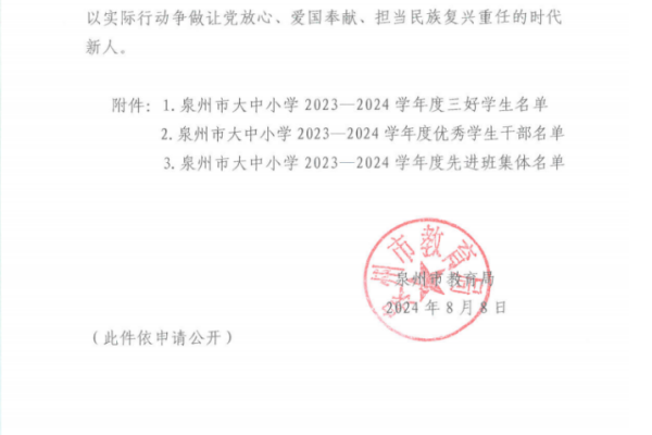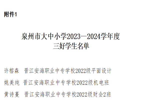 近日,泉州市教育局公布泉州市大中小学2023-2024学年度新时代三好学生、优秀学生干部、先进班集体名单。经过学生自荐、专业部推荐、学校推荐申报、教育局审核公示,我校2022级平面设计许榕森同学、22级机电班姚美纯同学、22级财会2班黄诗蔓同学荣获泉州市三好学生,22级机械五年专陈雅欣同学荣获优秀学生干部,22级平面设计班荣获优秀班集体荣誉称号。