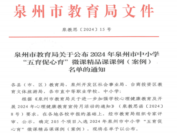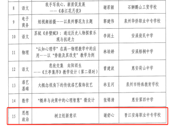 近日,泉州市教育局公布了2024年中小学“五育促心育”微课精品课课例评选结果,晋江安海职业中专学校谢舒心老师的思想政治课例《树立创新意识》荣获泉州市二等奖。此份荣誉,不仅是对谢舒心老师在教学实践中的努力和创新的认可,更是对我校在心理健康教育与“五育”融合推进过程中的持续努力的肯定。