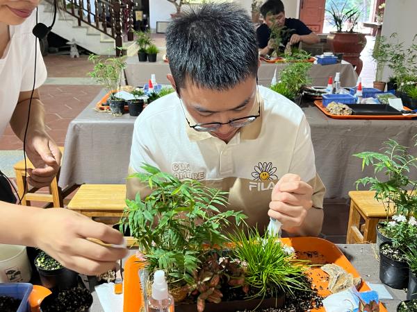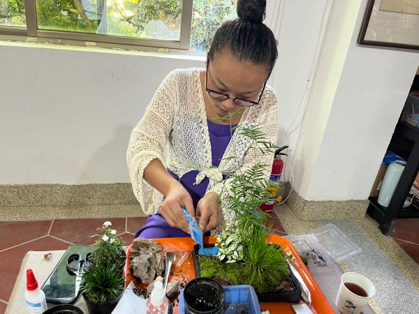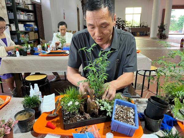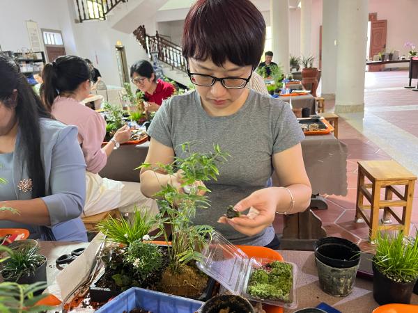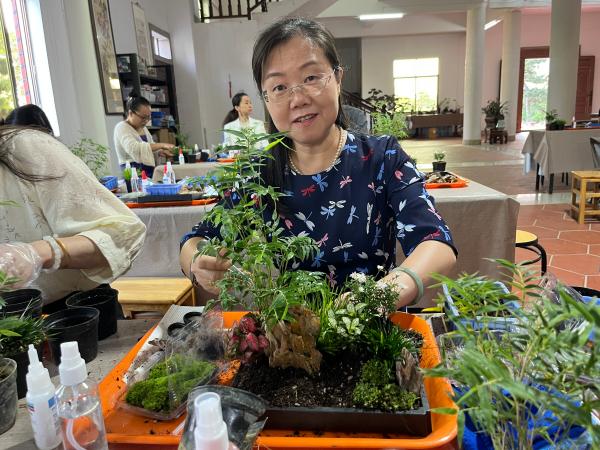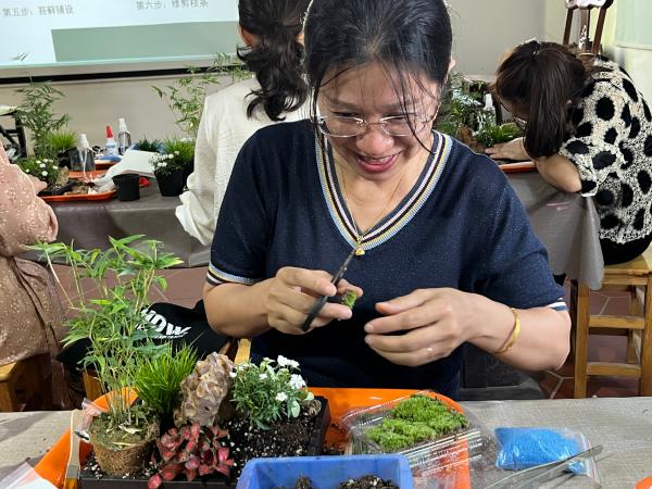 第二阶段则是一场充满创意与实践的园艺心理作品创作体验活动。刘老师和盆景园的园艺师姚老师一起向与会者传授了园艺制作的基本知识与技巧,为他们搭建起一座通往园艺心理创作的桥梁。在刘老师的耐心指导下,与会者纷纷动手,亲自制作属于自己的园艺作品。在创作的过程中,大家将心中的美好愿景融入手中的园艺作品之中,不仅充分享受到了动手制作的乐趣,更通过与自然的亲密互动,实现了心灵的净化与压力的释放,体验到了前所未有的身心愉悦。