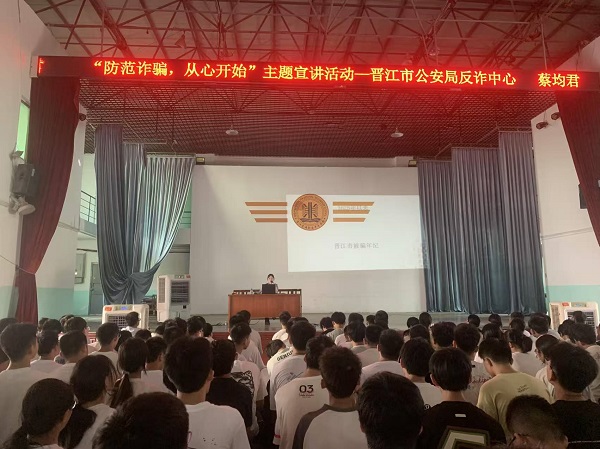为切实增强新生安全防范意识,提升识骗防骗能力,筑牢校园反诈防线,9月8日,晋江安海职业中专学校组织开展了以“防范诈骗,从心开始”为主题的2025级中职新生防诈宣传教育活动。本次活动特邀晋江市反诈骗中心资深警官蔡均君担任主讲人,为全体新生带来了一场内容详实、发人深省的反诈专题教育活动。