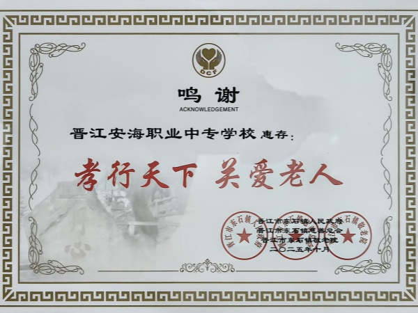 这张鸣谢牌匾,是晋江东石镇敬老院对晋江安海职业中专学校志愿工作的高度认可,也将激励着学校在公益之路上不断前行,让孝行之风继续吹拂校园的每一个角落,让更多的人感受到爱的力量。