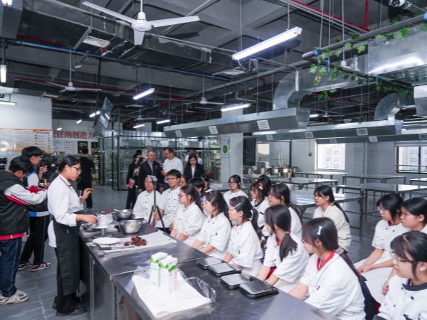 在B栋5楼,实训小导游孟艳带领嘉宾们依次参观了铺床实训室、水吧实训室、摆台实训室和烘焙实训室。每到一处,孟艳都结合实训课程设置、设备功能应用及学生技能培养成果进行详细讲解,全方位展示了基地实训教学的专业性与实用性。在烘焙实训室,嘉宾们现场品尝了学生亲手制作的甜点,香甜的口感与精致的造型让大家赞不绝口,充分肯定了基地技能人才培养的扎实成效。