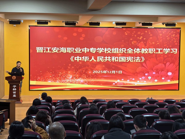 2025年12月1日,在全国第十二个“国家宪法日”和“宪法宣传周”(12月1日至7日)即将来临之际,晋江安海职业中专学校组织全体教职工集中开展《中华人民共和国宪法》专题学习活动,深入学习贯彻习近平法治思想,进一步增强教师队伍的宪法意识和法治素养。