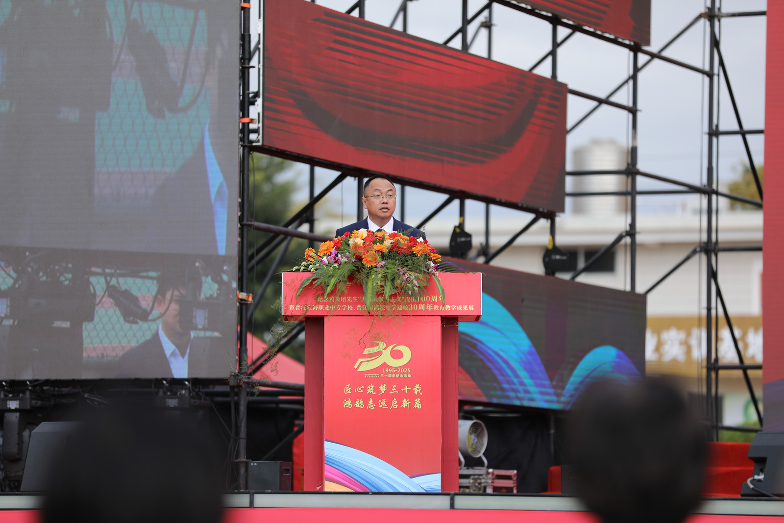 上午10:10,庆典大会在庄严国歌声中拉开序幕。学校党总支书记黄源华首先代表学校致欢迎辞,回顾了三十年来学校坚持立德树人、服务发展、促进就业的办学成就,强调学校始终与区域发展同频共振,培养了大批高素质技术技能人才,并展望了未来发展蓝图。