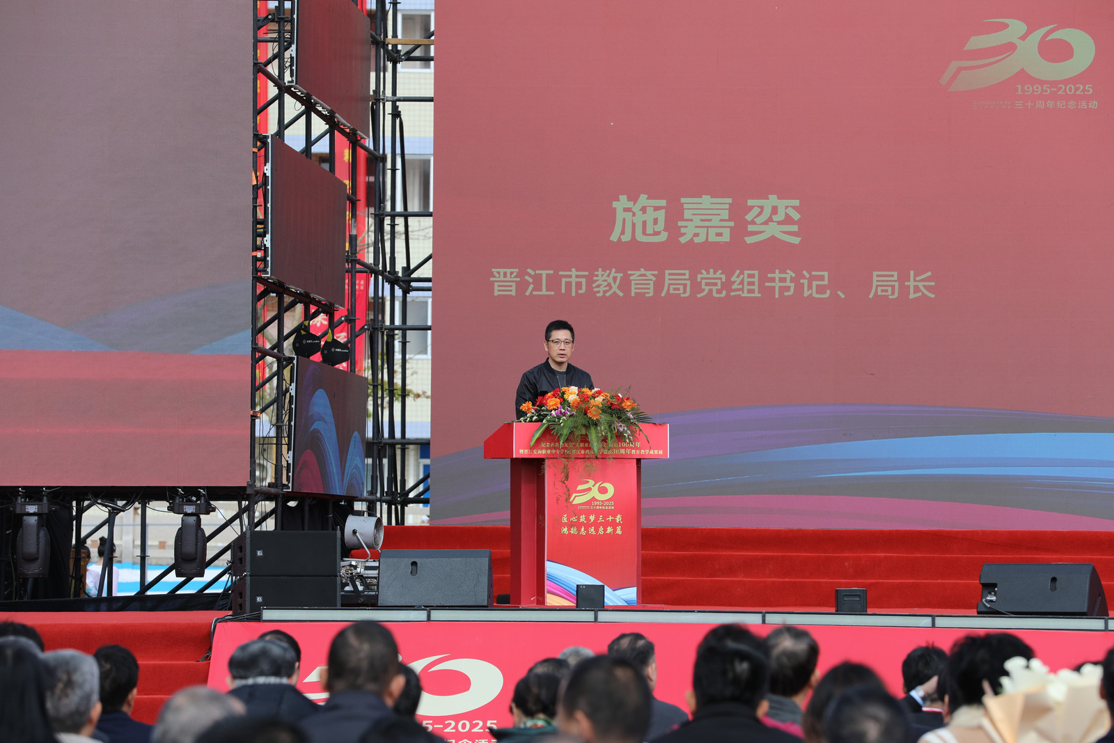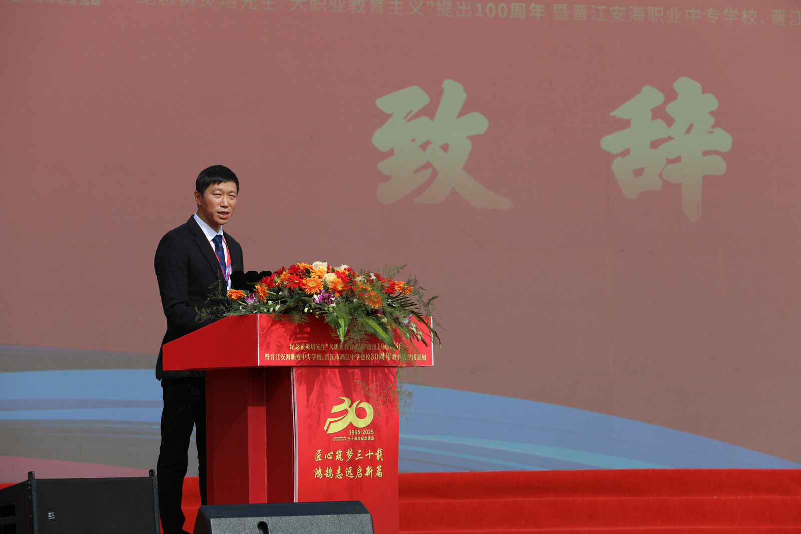 吴尊意副市长代表市委、市政府祝贺安海职校,感谢各界对晋江教育事业的关心支持。他强调,市委市政府全力构建现代职教体系,推动职业教育与区域产业协同共进。吴副市长希望安海职校以30年为新起点,打造特色品牌专业,培育高技能人才。他坚信,在各方助力下,学校将为晋江职业教育高质量发展贡献更大力量。