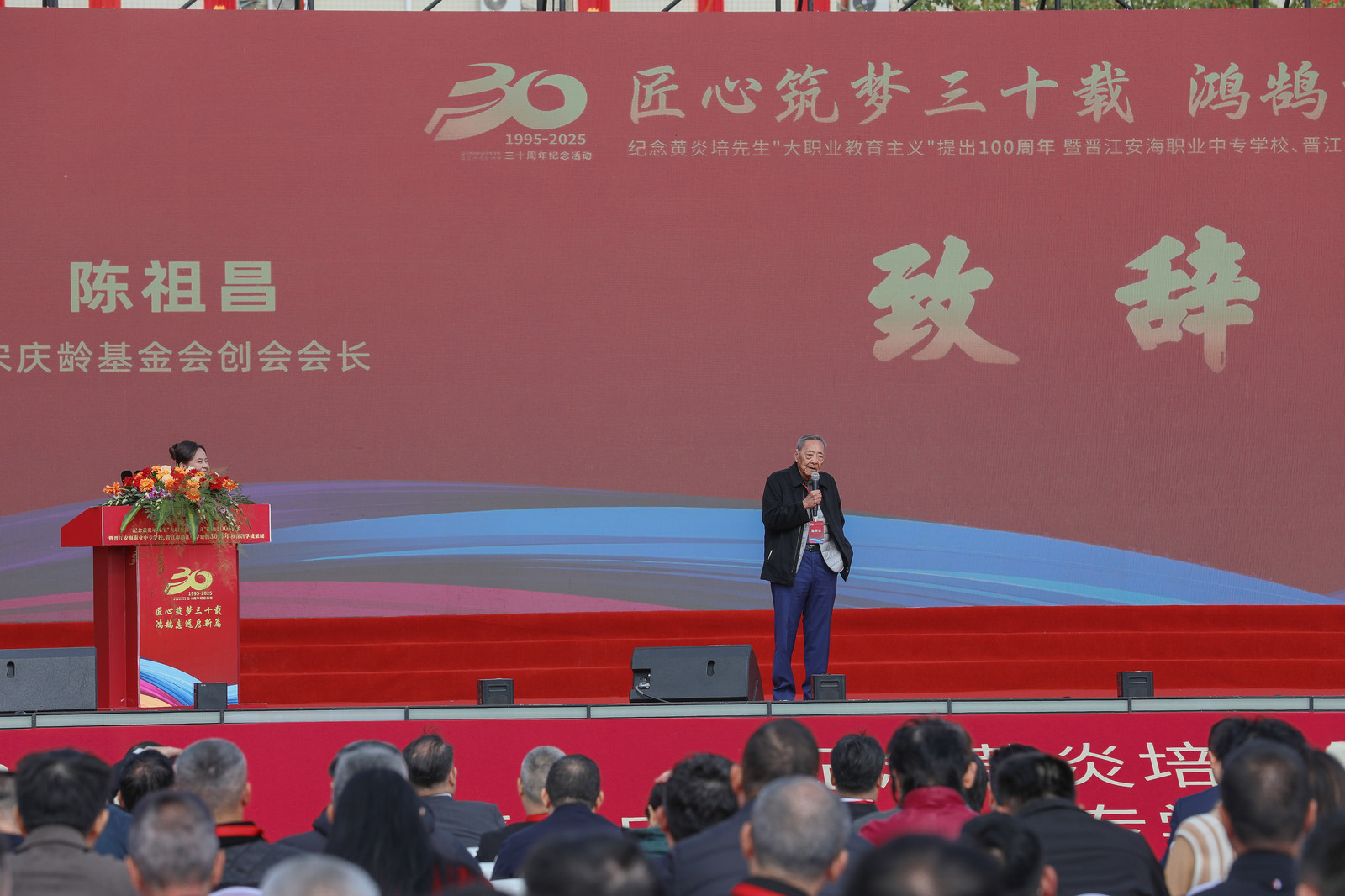 12月27日,校园装扮一新,彩旗飘扬,阳光和煦,洋溢着喜庆与自豪的气氛。活动现场,气氛庄重而热烈。海内外千余名嘉宾、社会各界贤达、校友代表及师生代表怀着对学校发展的深切关注与美好期许,齐聚一堂,共同见证这所学校发展史上的重要里程碑。其中,海内外的侨亲,主要来自香港、澳门、菲律宾、新加坡、印尼等地的侨亲代表,他们跨越山海赴约,共襄盛举。大家一同回首学校三十年砥砺奋进的征程,共同展望职业教育高质量发展的光明未来。