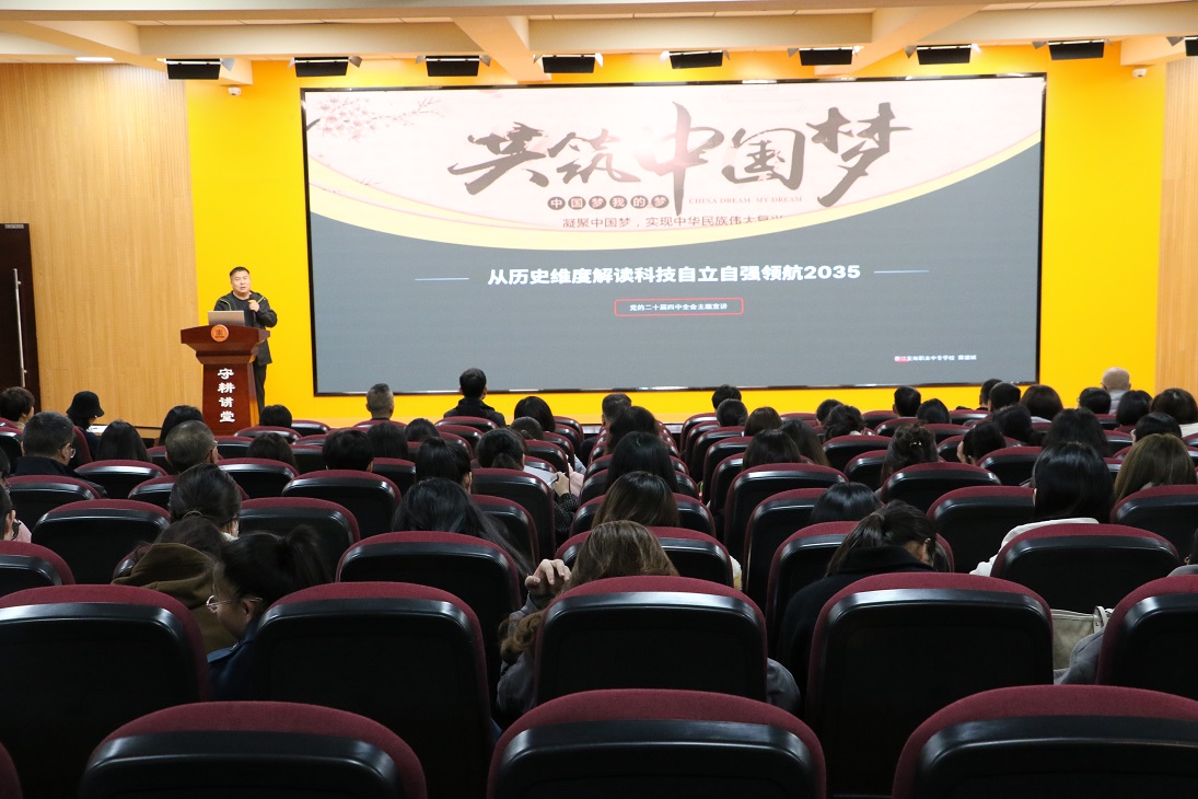会上,晋江市教育系统“初心”讲师团成员雷建斌以《从历史维度解读科技自立自强领航2035》为题,为全体党员和教师作系统阐释和深入解读。雷老师从全会概况、辉煌成就、核心要义、实践要求和使命担当等方面内容,系统解读了党的二十届四中全会的重大意义与战略部署,重点围绕“十五五”规划中“教育科技人才一体化发展”“完善科教协同育人机制”等核心要求,结合职校和综合高中“职普融通、产教融合”的办学特色,深入阐释了学校在新时代教育高质量发展中的定位与使命。他强调,全体教师要以全会精神为指引,将“培养创新型人才”“深化教育教学改革”的要求融入日常教学,立足三尺讲台,担当育人使命,为构建科教协同育人机制、办好人民满意的教育贡献力量。