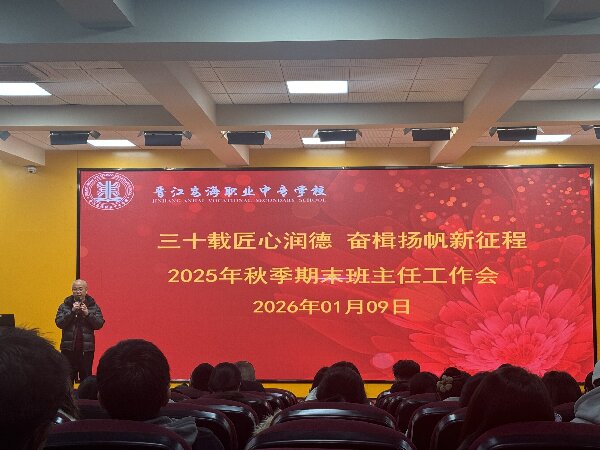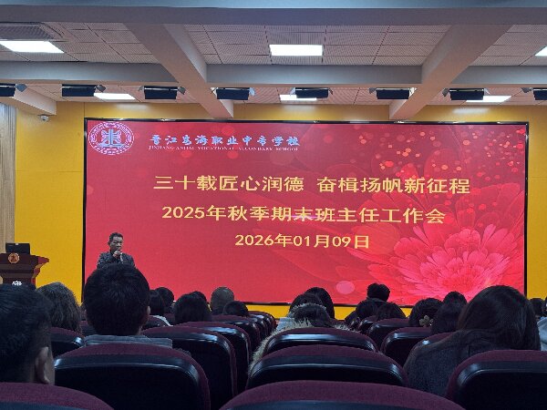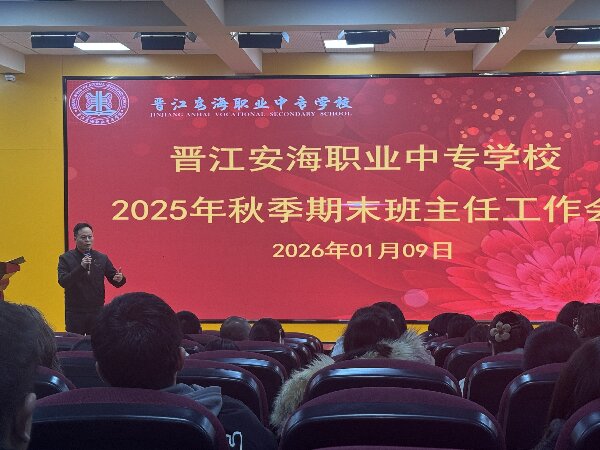 2026年1月9日下午,根据学校工作安排,在政教处的组织下,晋江安海职业中专学校在实训中心一楼报告厅召开了2025年秋季学期期末班主任工作会。会议由政教处副主任张金斗主持,安海校区德育团队、见习班主任参加了此次会议。