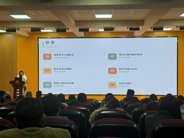培训中,黄老师结合实例分析寒假学生易因作息紊乱、社交减少、家庭矛盾及学业压力叠加引发心理困扰,提示班主任留意情绪低落、网络沉迷、睡眠饮食异常等信号;建议通过假期前主题班会统一认知,以线上交流保持联系,布置有意义任务引导学生正向生活,并对特殊群体给予重点关注与个性化支持,实现早识别、早干预。此外,培训还汇总了专业心理援助资源及全国、省、市心理援助热线,保障师生、家长及时获取帮助。