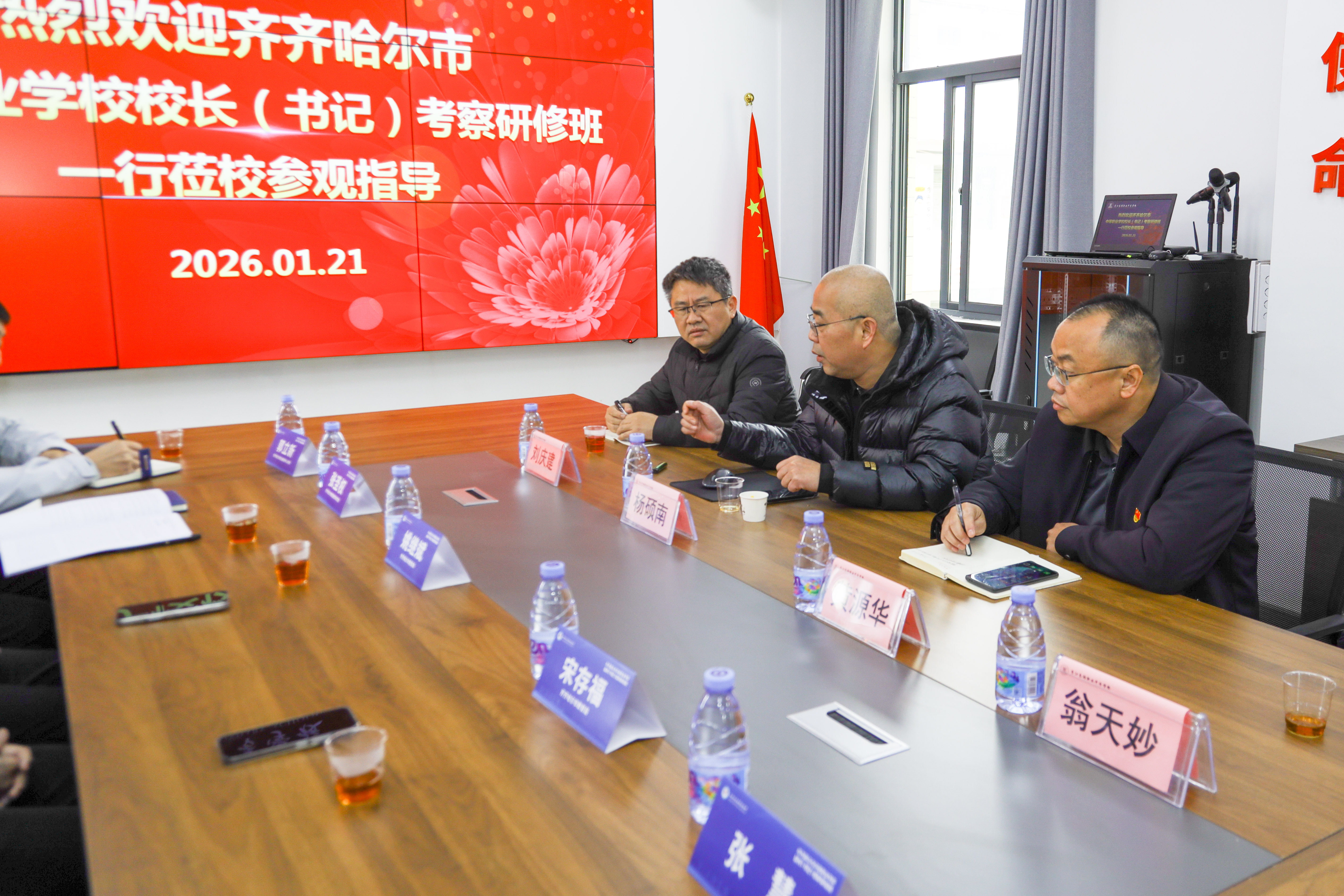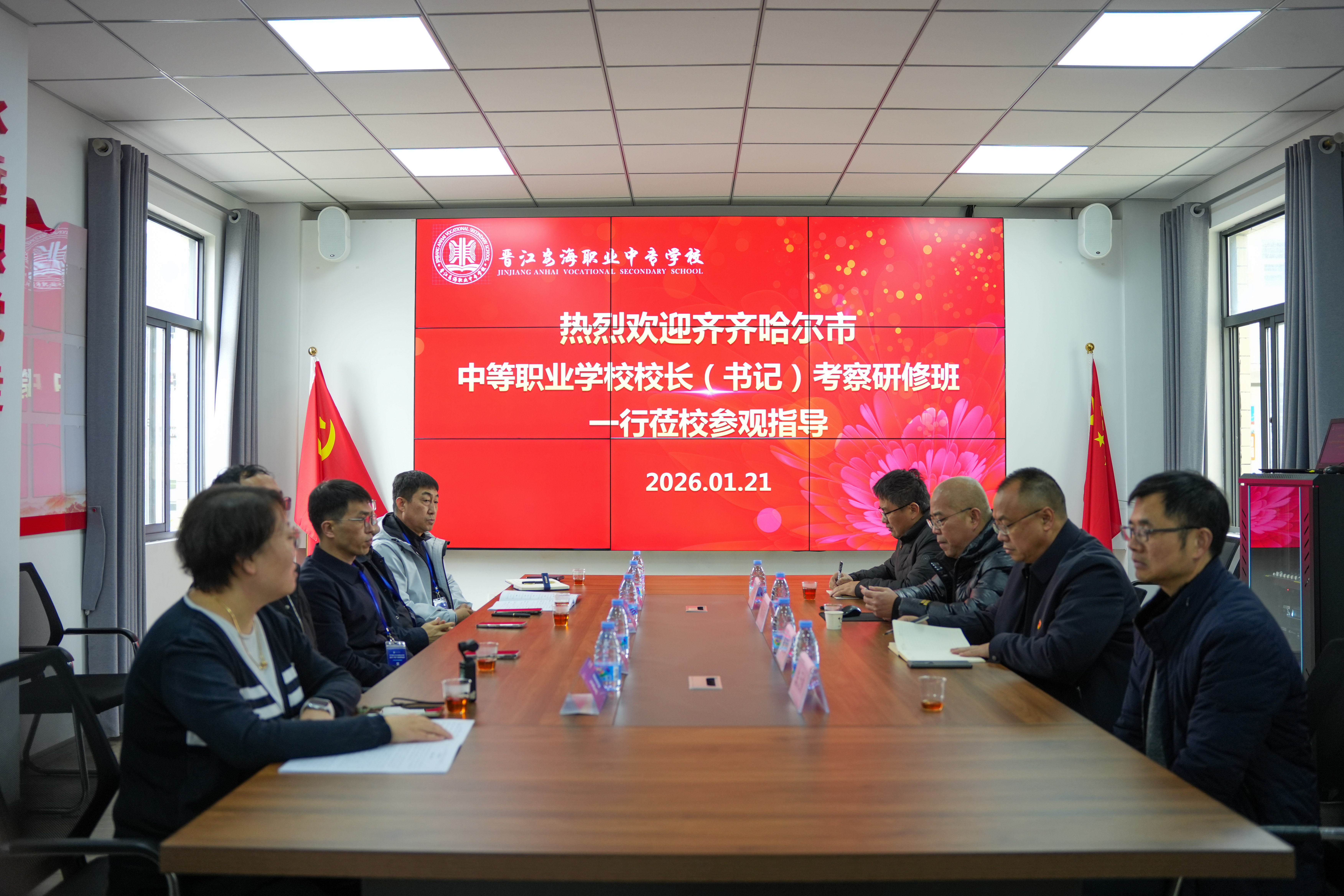 2026年1月21日,晋江安海职业中专学校迎来新年的首批贵客,黑龙江省齐齐哈尔市中等职业学校校长(书记)考察研修班一行远道而来,莅临我校参观交流。此次交流活动围绕中职教育高质量发展的具体路径展开了务实探讨,凝聚了两地职教人对提升办学质量、推动创新发展的共同期待。我校党总支书记黄源华、校长杨硕南携领导班子对研修班一行的到来表示诚挚欢迎,并全程陪同考察交流。
