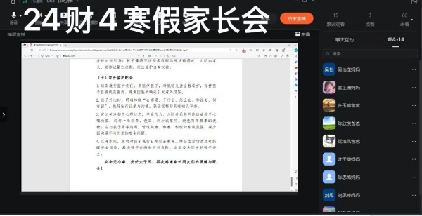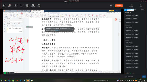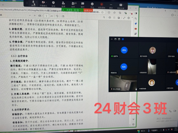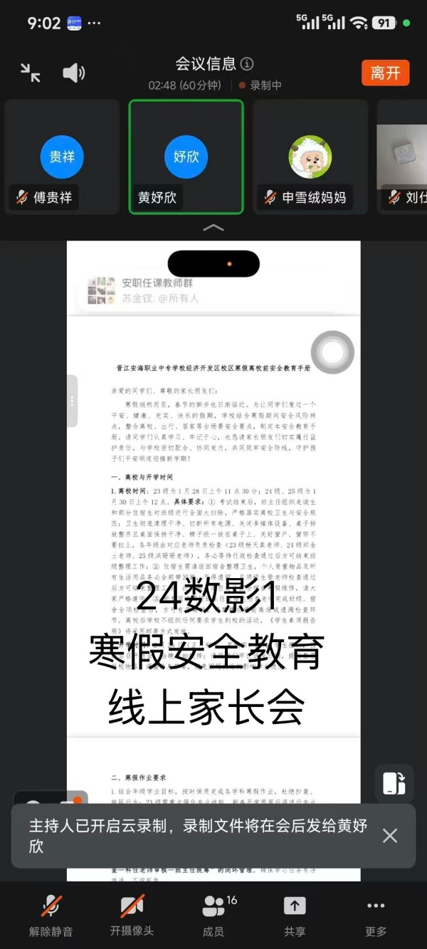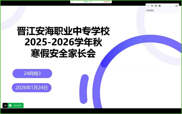 为切实筑牢寒假安全防线,深化家校协同育人效能,凝聚育人合力,近日,晋江安海职业中专学校经济开发区校区以班级为单位,组织28个班级的1250名学生家长齐聚“云端”,分班级召开寒假线上家长会。各班班主任化身“主播”,与家长们跨越空间阻隔,共话孩子成长,共商寒假规划,为孩子们的平安假期、健康成长保驾护航。