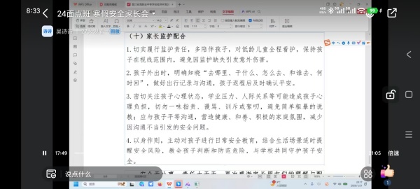 此外,班主任还就寒假离校时间、开学报到安排、学生素质报告册邮寄等事宜进行了逐一说明,针对家长关心的自主实习合规性、假期作息调整、心理健康疏导等问题,进行了耐心解答与互动交流。班主任们真诚的分享、细致的指导,让家长们清晰了解了学校的假期安排与育人理念,也感受到了学校对每一位学生的关爱与责任。