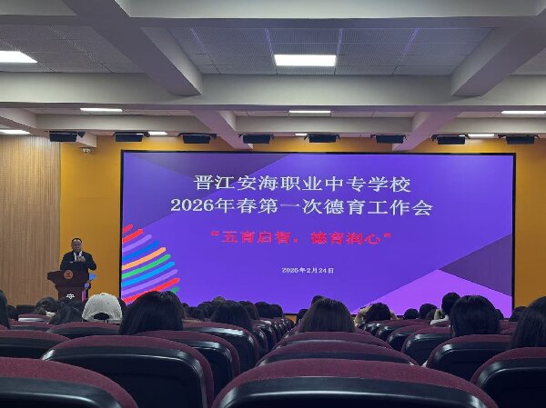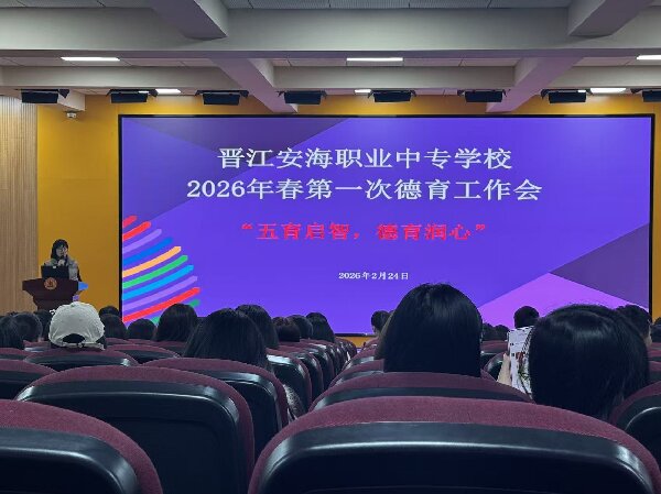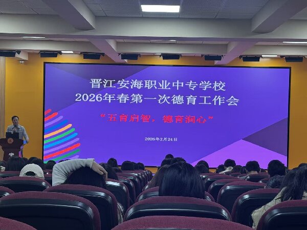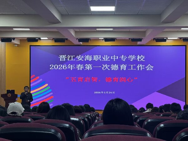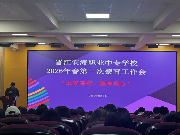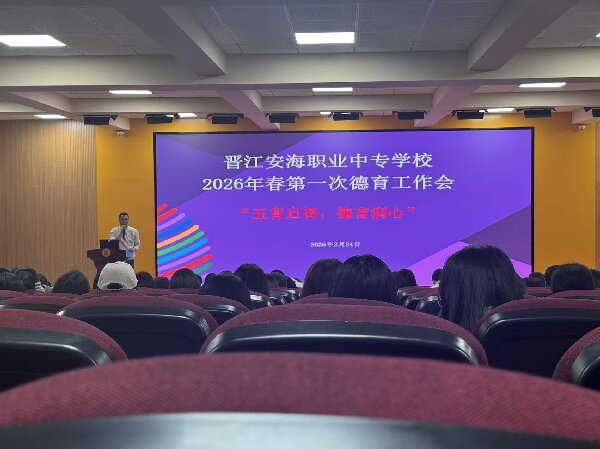2026年2月24日下午,根据学校工作安排,在政教处的组织下,晋江安海职业中专学校在实训中心一楼报告厅召开了2026年春季学期第一次德育工作会。会议由政教处副主任张金斗主持,黄源华书记、分管领导、相关处室、德育团队和入职未满三年的新教师参加了此次会议。